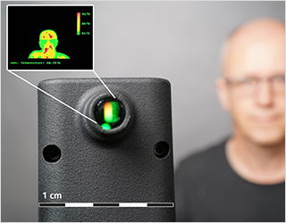 Das Fraunhofer FEP hat im EU-geförderten Projekt INNO4COV-19 den Prototypen eines handlichen Thermokamera-Systems mit integrierten, stromsparenden OLED-Mikrodisplays zur frühzeitigen und kontaktlosen Erkennung von Personen mit erhöhter Körpertemperatur entwickelt.