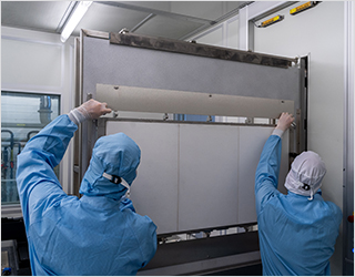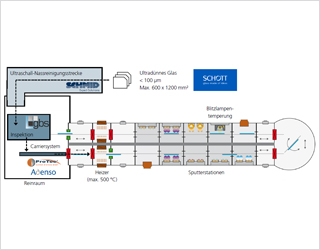 Für die im industriellen Maßstab pilotierungsfähige Fläche von 1200 × 600 mm2 wurde im Rahmen des vom BMBF geförderten Projektes Glass4Flex (FKZ 13N14615) eine in-line Prozesskette für flexibles Ultradünnglas aufgebaut. Sie ermöglicht die vertikale inline-Vakuumbeschichtung dieses innovativen Substratmaterials auch auf großer Fläche und besteht aus folgenden Komponenten: