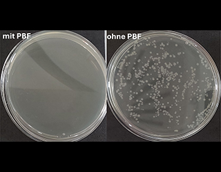 In unseren Untersuchungen werden verschiedene Modell-Mikroorganismen betrachtet, um die hygienisierende Wirkung von PBF unter variierenden Herstellungs- und Umgebungsbedingungen zu bewerten. Beispielsweise konnte bereits bei einer kurzen Behandlungszeit von nur 5 Minuten an Verunreinigungen aus Escherichia coli eine Reduktion um 99,99 % erzielt werden (siehe Abbildung). Zur Untersuchung der Reinigungsleistung kann beispielsweise die schonende Entfernung von Graphitresten auf porösen Quarzoberflächen angeführt werden.