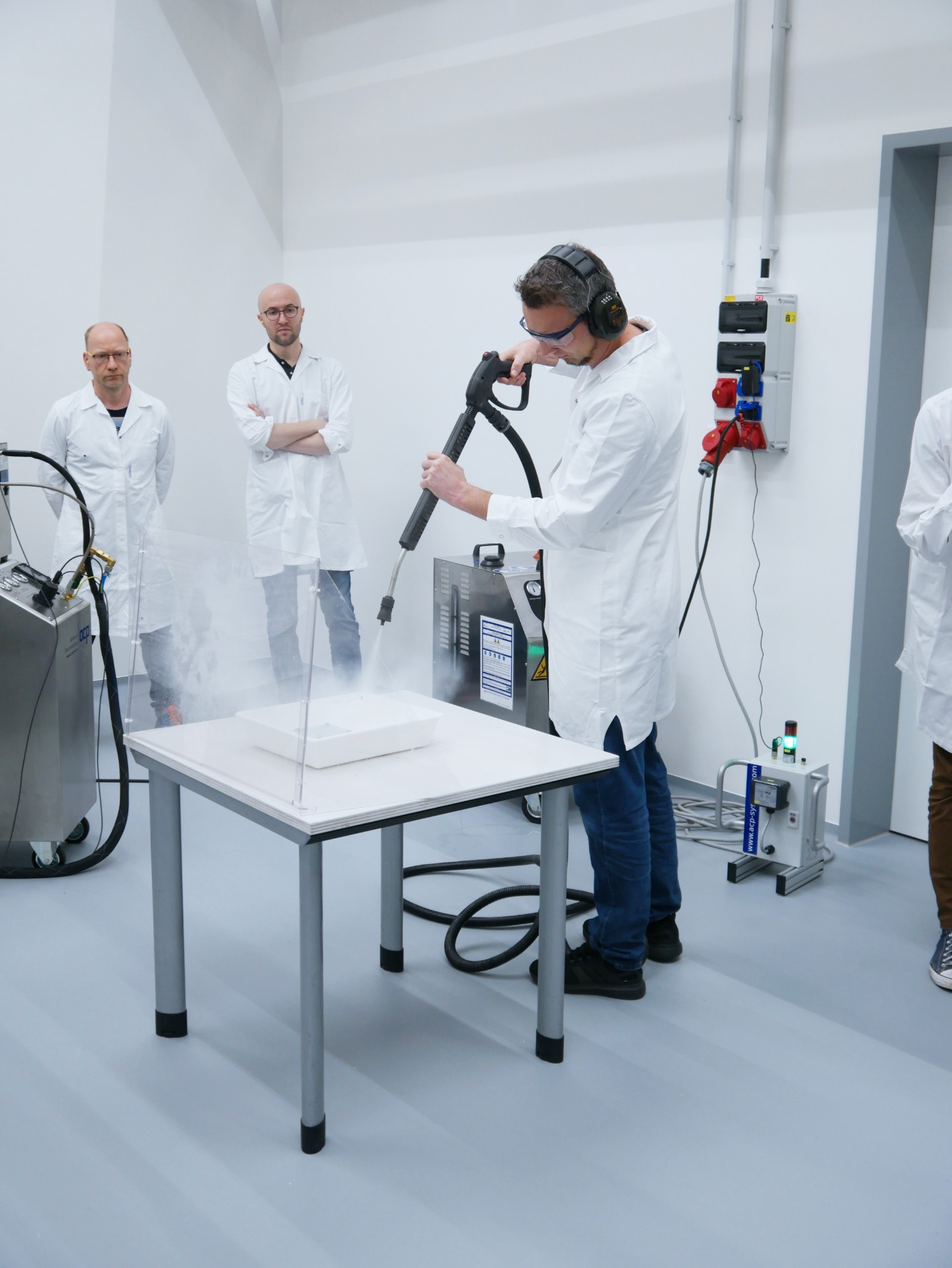 Laboratories at all four project partners are available for training practical skills. These include a laser laboratory at the Fraunhofer Institute for Material and Beam Technology IWS in Dresden. The Fraunhofer Institute for Manufacturing Engineering and Automation IPA in Stuttgart offers special laboratories on the topics of cleanrooms and particle cleanliness. The simulation and practical implementation of spray cleaning are available in the laboratories of Fraunhofer IVV Dresden, among others. Depending on the scope of the project, either live video or direct on-site use is offered.